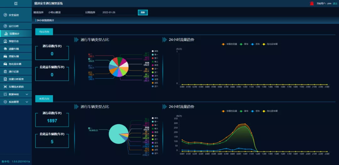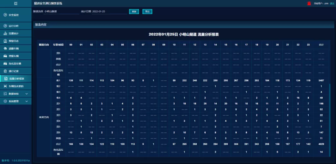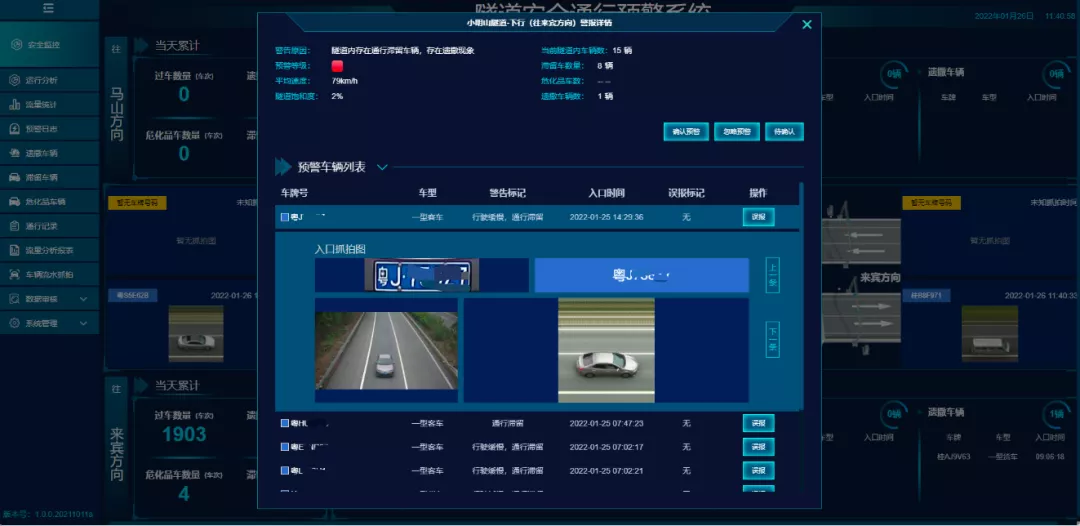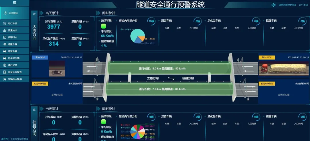 該系統(tǒng)能夠通過西凌井特長隧道出入口視頻監(jiān)測卡口和車型識別功能,準(zhǔn)確掌握隧道內(nèi)車輛的實(shí)時(shí)數(shù)量、車型、車牌及車輛圖像,進(jìn)一步精準(zhǔn)判別?;奋囕v,并根據(jù)隧道區(qū)間里程長度、限行速度計(jì)算隧道內(nèi)車輛理論通行時(shí)間,對超時(shí)未閉合信息的車輛及時(shí)提示預(yù)警。同時(shí)該系統(tǒng)還具備車輛統(tǒng)計(jì)、數(shù)據(jù)分析、數(shù)據(jù)導(dǎo)出等功能,為隧道通行狀況分析統(tǒng)計(jì)提供了有力數(shù)據(jù)支撐,配合隧道視頻監(jiān)控和視頻事件檢測系統(tǒng),成功實(shí)現(xiàn)了隧道危化品車輛運(yùn)行動態(tài)監(jiān)測。該系統(tǒng)相比國內(nèi)部分路段采用的毫米波雷達(dá)跟蹤辨識技術(shù),費(fèi)用僅是其十分之一,且施工周期不到一周,有著投資小、工期短、見效快的顯著優(yōu)勢。