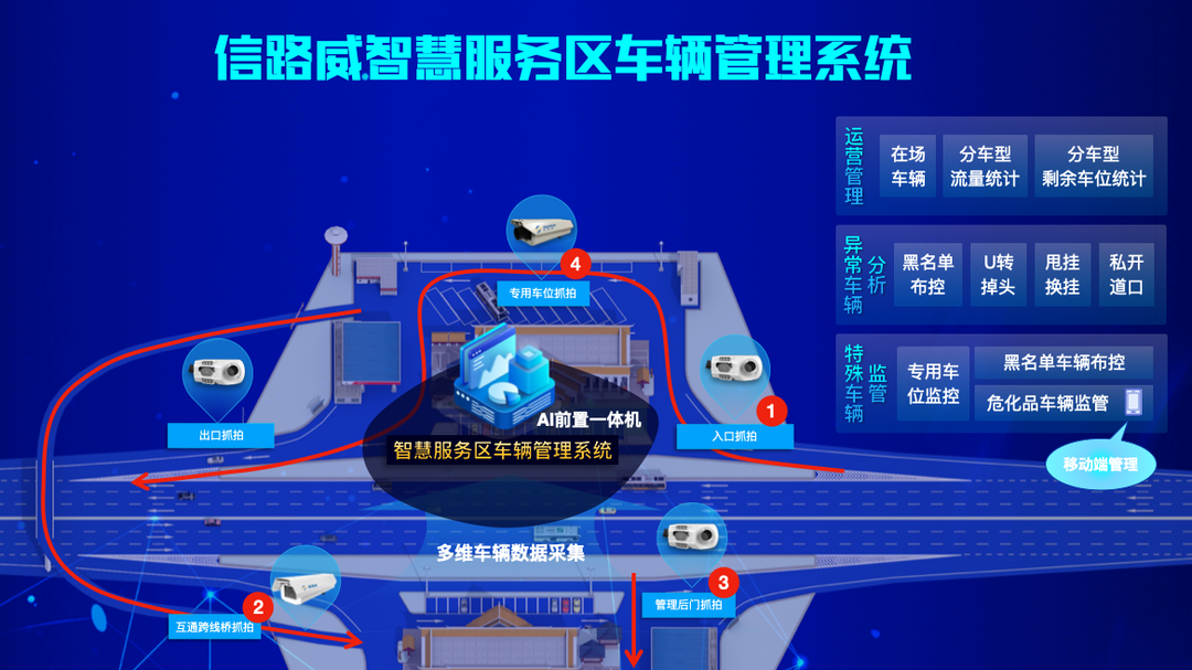 信路威智慧服務區(qū)車輛管理系統(tǒng),通過在服務區(qū)入出口匝道、內部互通通道、專用車位等位置部署智能識別一體機,實現對服務區(qū)所有通道的車流全覆蓋識別,精準采集通行車輛的多維數據;同時運用公眾號/小程序等實現對?;返溶囕v進行無紙化管理;對異常車輛進行分析處理,在服務區(qū)入出口抓拍,深挖貨車換掛、貨車換牌的違法行為,對在服務區(qū)內的U轉行駛、私開道口等可疑逃費行為進行全景監(jiān)管,為高速收費稽核提供服務區(qū)關鍵節(jié)點的輔助核查數據。