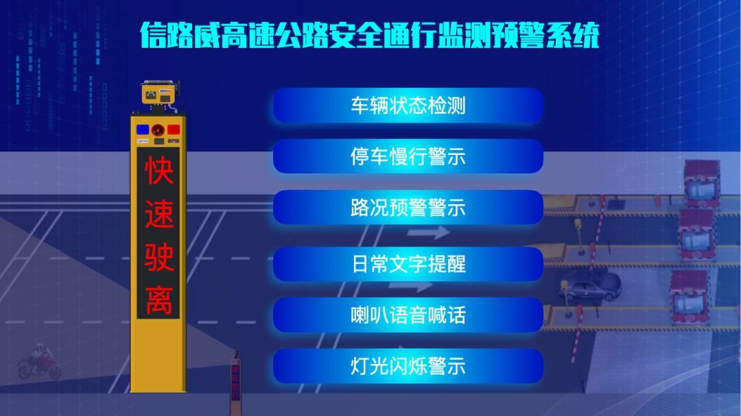 信路威以AI賦能,助力高速公路安全通行,推出高速公路安全通行監(jiān)測預警系統(tǒng),在分流匝道路口、匯入匝道路口、隧道、下坡、彎道、雨雪霧等重點路段部署智能設備“高速哨兵”,可實現車輛狀態(tài)檢測、停車慢行警示、路況預警警示 、日常文字提醒、喇叭語音喊話、燈光閃爍警示等功能,降低了高速公路事故率和死亡率,為高速行車安全風險進行預警和提醒。